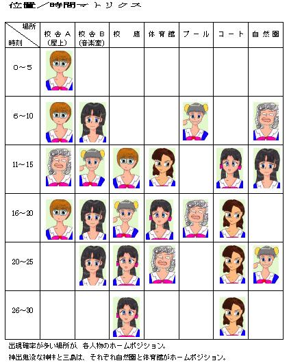というのも、これがわかってしまうとHalf an Hourの全員クリアが結構あっさりいってしまうことが多いからです。 どうしてもゲーム中、お目当ての人にお目当ての場所で会えない人だけ、参照してください。