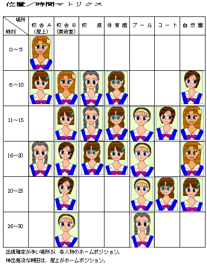 一度出現した人物は、2度目以降は出てきません。 たとえば、4時37分にのん子に会ってしまったら、 42分に校庭へ行っても会えません。